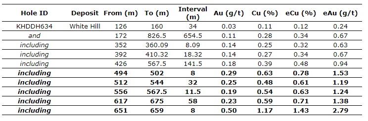 Several drill holes have encountered materially better grade relative to the White Hill MRE resource grade. Drill hole KHDDH638, located on the southern margin of the White Hill deposit, targeted a mineralized and resource controlling fault, intersecting a significantly higher-grade zone of copper and gold mineralization that is located below the current optimized pit design.