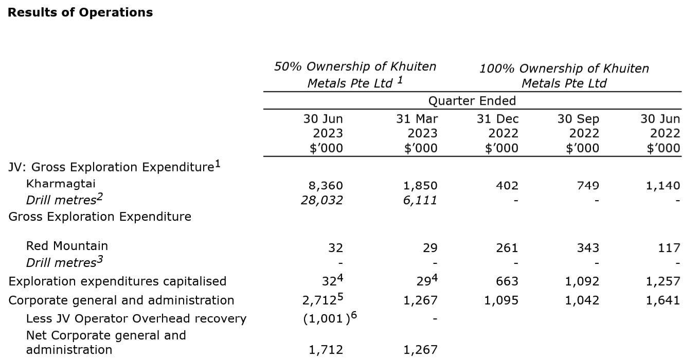 On 30 June 2023, the Company had 1,637,824,191 fully paid ordinary shares and 121,860,000 options over ordinary shares on issue and approximately A$5.1 million in cash. The Khuiten JV, which controls the Kharmagtai project, had US$26.8 million in cash available to progress the Kharmagtai PFS and exploration.