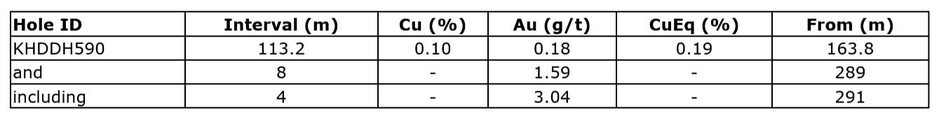 (Figure 5), drilling targeted surface copper anomalism and outcropping porphyry veining. Drill Hole KHDDH589 intercepted a broad zone of low-grade porphyry mineralisation from surface, suggesting the hole has passed over and to the north of a potential shallow porphyry. Drill hole KHDDH589 returned:20