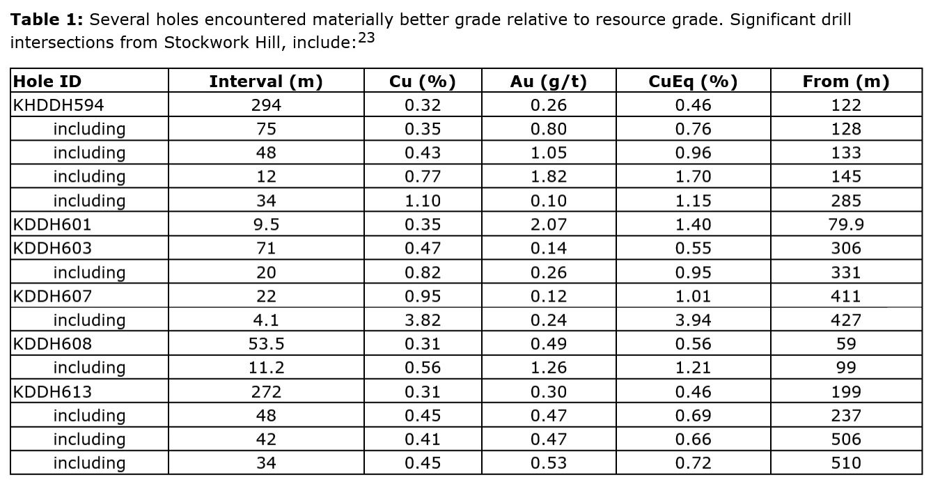 Table 1: Several holes encountered materially better grade relative to resource grade. Significant drill intersections from Stockwork Hill, include: