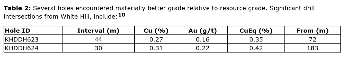 Several drill holes have encountered materially better grade relative to the White Hill MRE resource grade. Drill hole KHDDH638, located on the southern margin of the White Hill deposit, targeted a mineralised and resource controlling fault, intersecting a significantly higher-grade zone of copper and gold mineralisation that is located below the current optimised pit design (Table 2).