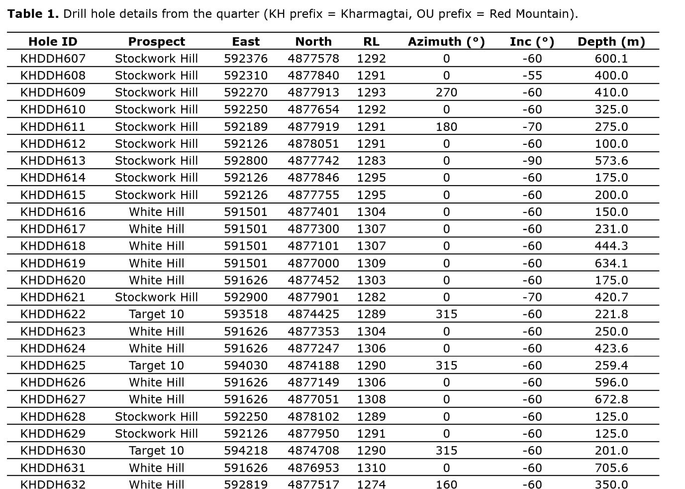Approximately 27,000m of Phase One diamond drilling has been completed (out of 30,000m total) at both the Stockwork Hill and White Hill deposits, at Kharmagtai. All drill data can be found in Appendix 3.