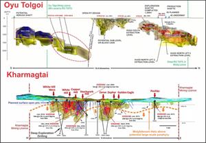 Long Sections through the Oyu Tolgoi Porphyry System and The Kharmagtai Porphyry System. Deep high-grade exploration drill program geochemical zonation points to much larger system beneath Kharmagtai. (17)