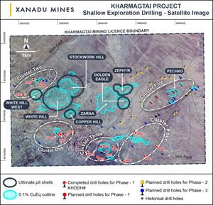 Kharmagtai copper-gold district showing currently defined mineral deposits and planned and completed shallow exploration drill holes. Blue outlines are 2021 scoping study open pit designs and white dashed outlines define porphyry cluster target areas. (19)