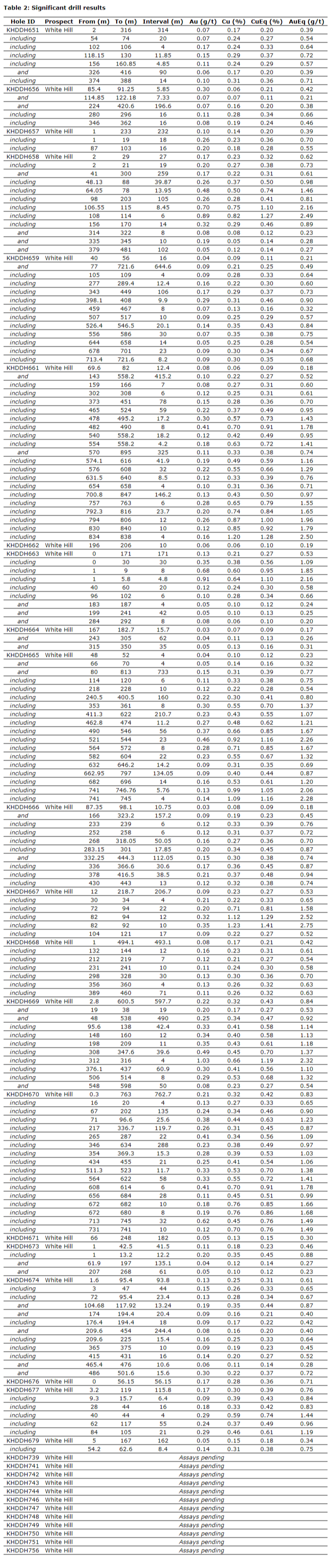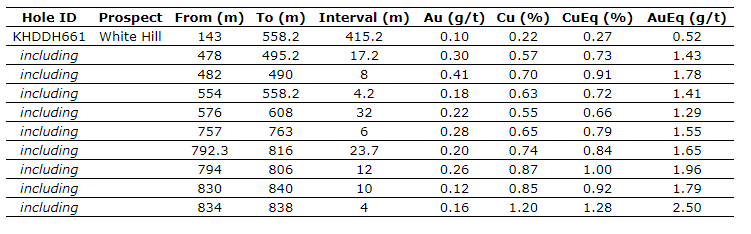 Drill hole KHDDH661, located on the southern margin of the White Hill deposit, intersected a significantly higher-grade zone of copper and gold mineralization, on the margin of the current optimised pit design (Figures 1 and 2).