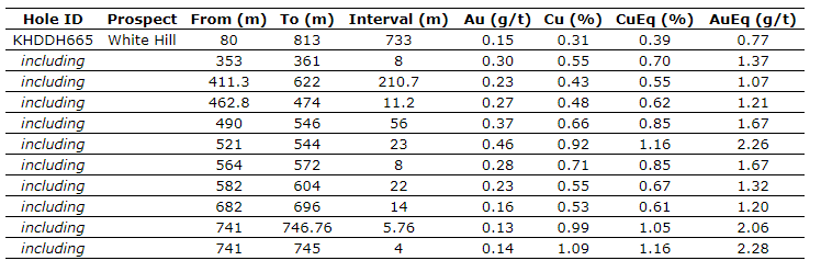 - KHDDH665 - 733 metres of 0.39 per cent eCu (0.31 per cent copper and 0.15 gram per tonne gold) from 80m