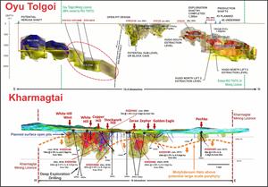Long Sections through the Oyu Tolgoi Porphyry System and The Kharmagtai Porphyry System. Deep high-grade exploration drill program geochemical zonation points to much larger system beneath Kharmagtai.