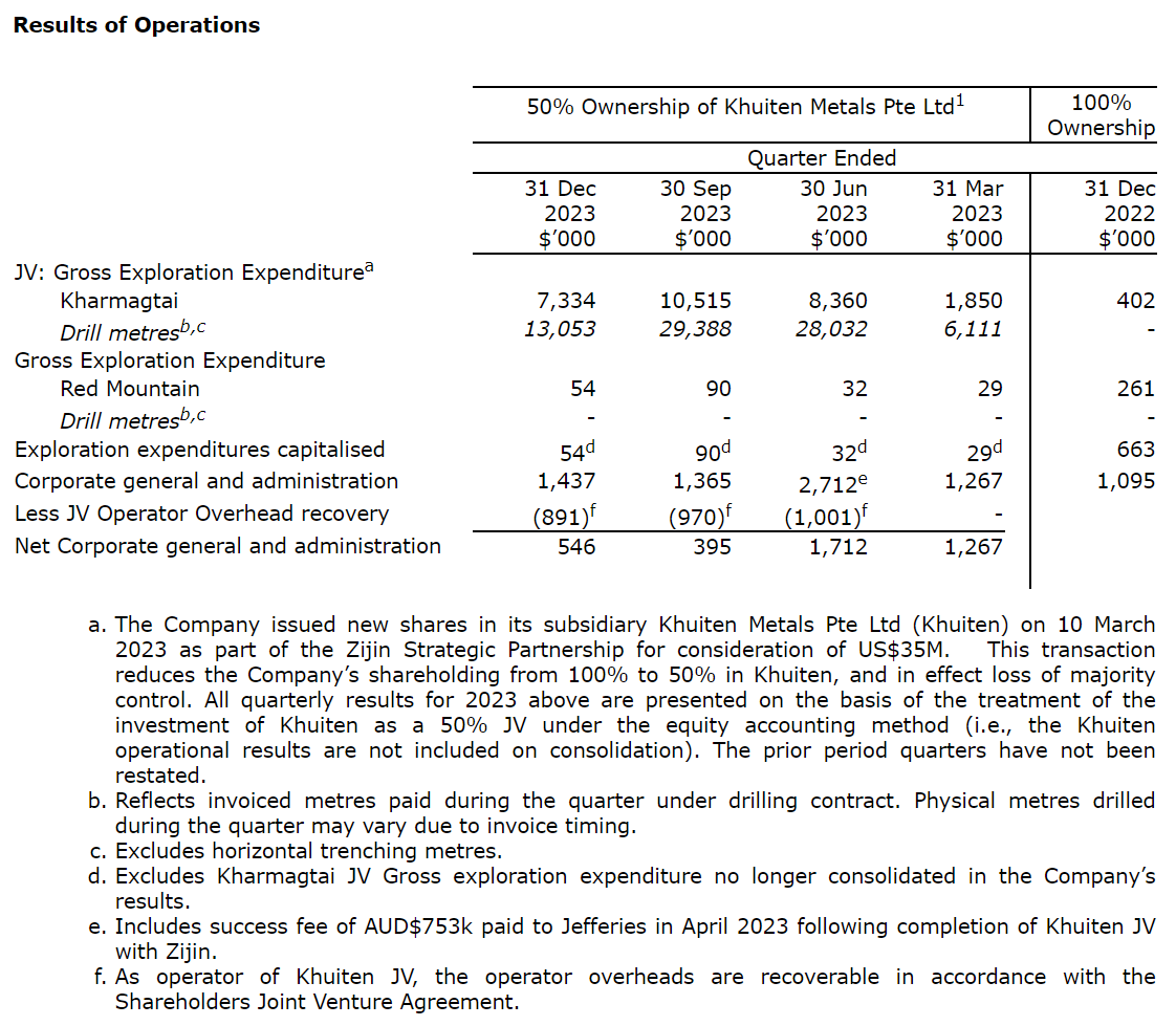 On 31 December 2023, the company had 1,700,820,681 fully paid ordinary shares and 121,860,000 options over ordinary shares on issue, and approximately A$7.3 million in cash. This total of ordinary shares excludes the Tranche 2 placement to Zijin which remains subject to shareholder approval at the EGM scheduled on 6 February 2024 (see below). The Khuiten JV, which controls the Kharmagtai project, had US$11.7 million in cash available to progress the Kharmagtai PFS and exploration.
