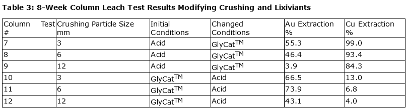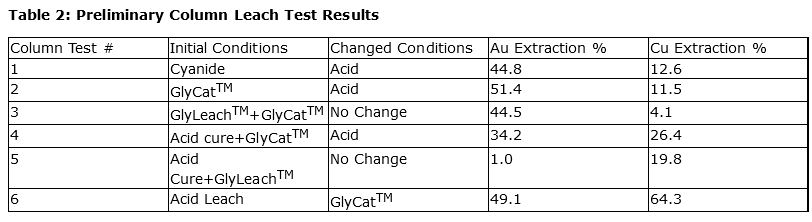 Results indicate that a combination of acid and GlyCat could extract a similar amount of gold and copper as the diagnostic leaches, with column test No. 6 extracting 49.1 per cent Au and 64.3 per cent Cu over 10 weeks.