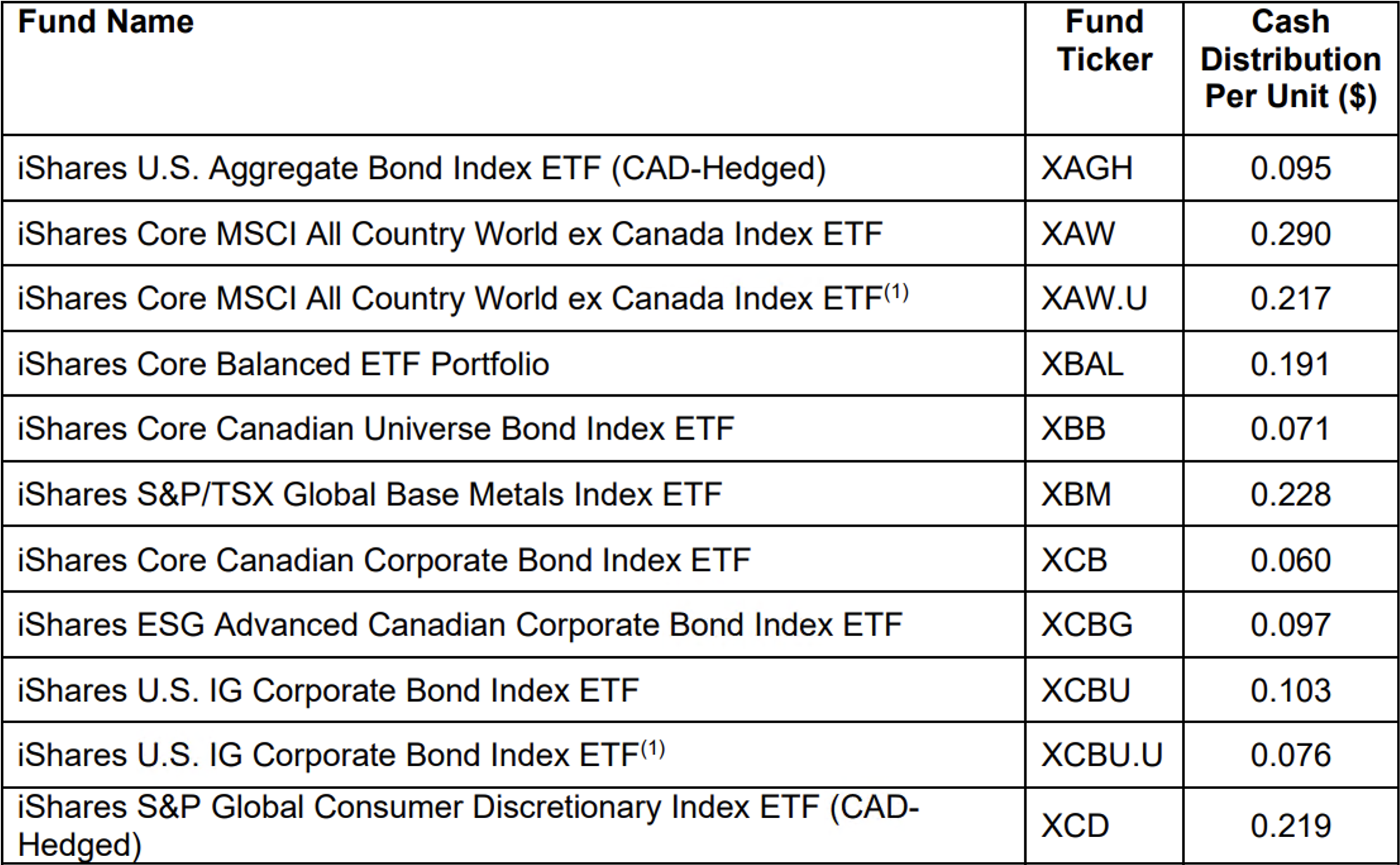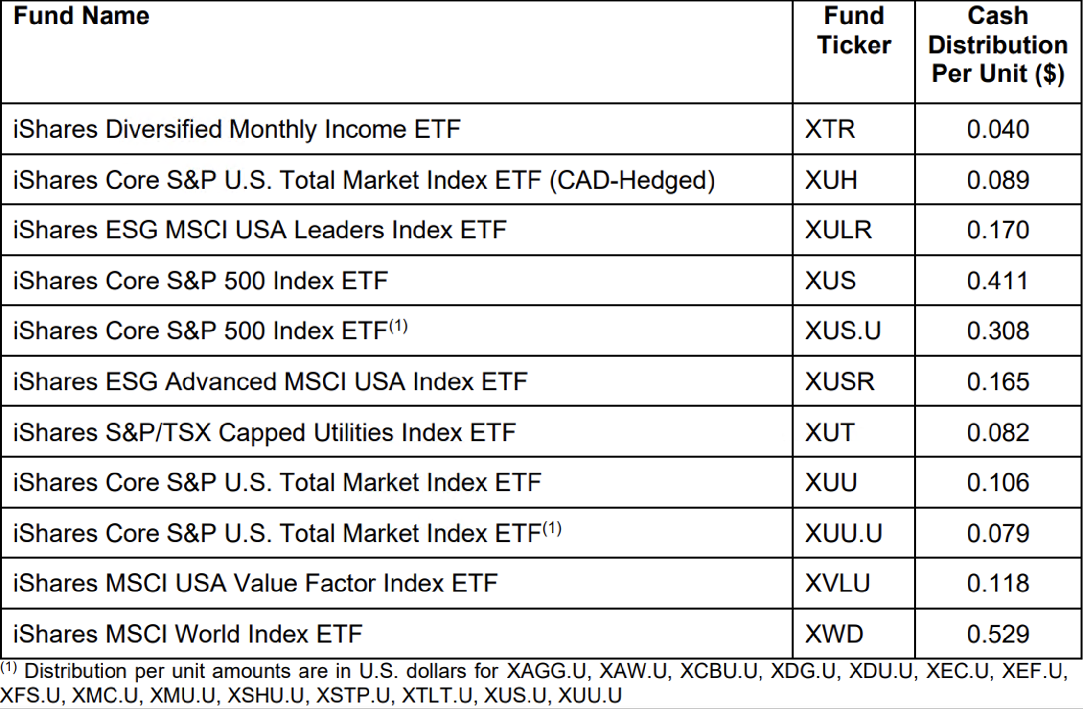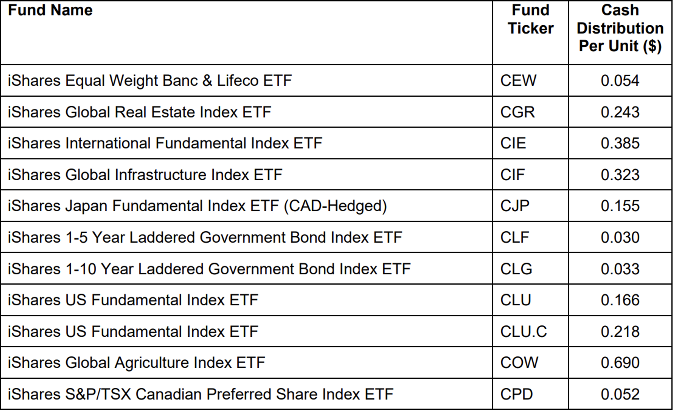 BlackRock Asset Management Canada Ltd. has declared the June, 2023, cash distributions for the iShares exchange-traded funds listed on the Toronto Stock Exchange or Cboe Canada which pay on a monthly, quarterly or semi-annual basis, as well as a reinvested distribution for iShares Canadian Real Return Bond Index ETF. Unitholders of record of a fund on June 27, 2023, will receive a distribution payable in respect of that fund on June 30, 2023.