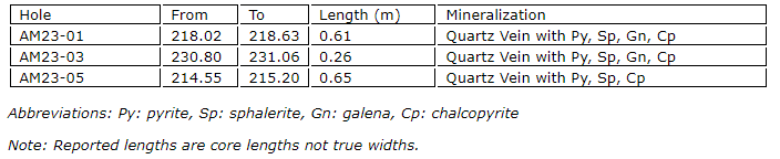Holes AM23-03 and 04 intersected a mineralized vein about 50 metres south of the target vein that appears to be a new discovery of a parallel vein. The extent of this vein has yet to be determined.