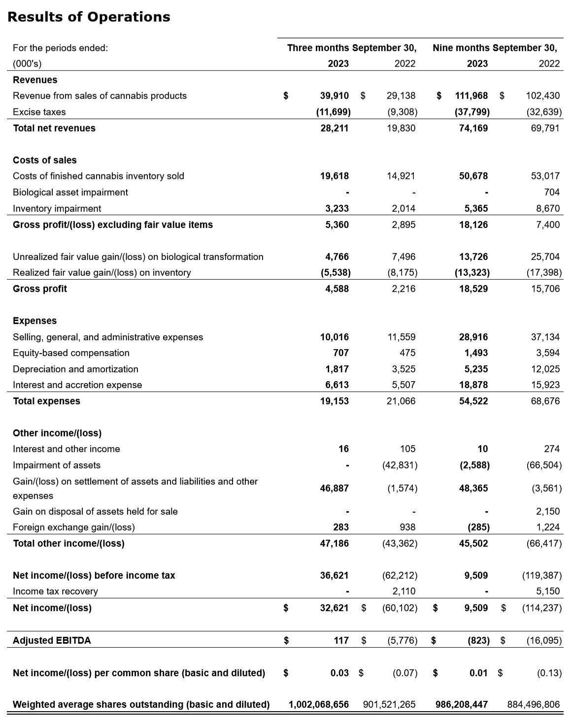 Net income for the three months ended September 30, 2023 was $32.6 million, representing a net income of $0.03 per share on a basic and diluted basis. The change in net income in the third quarter of 2023 as compared to a net loss of $60.1 million for the same period of 2022 was primarily driven by the gains on the extension of the Imperial Brands Debenture and changes in total expenses and improved gross profits. The net loss of $114.2 million through nine months of 2022 includes the net impact of approximately $25.7 million related to the closure of the Auxly Annapolis and Auxly Annapolis OG facilities during the first quarter of 2022.