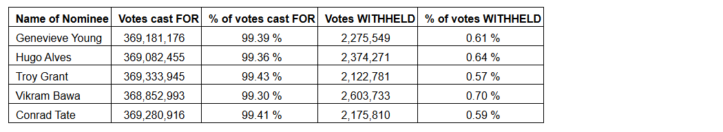 A total of 371,890,083 common shares of the company, representing 28.23 per cent of the issued and outstanding common shares of the company, were voted in connection with the meeting by shareholders and proxyholders.