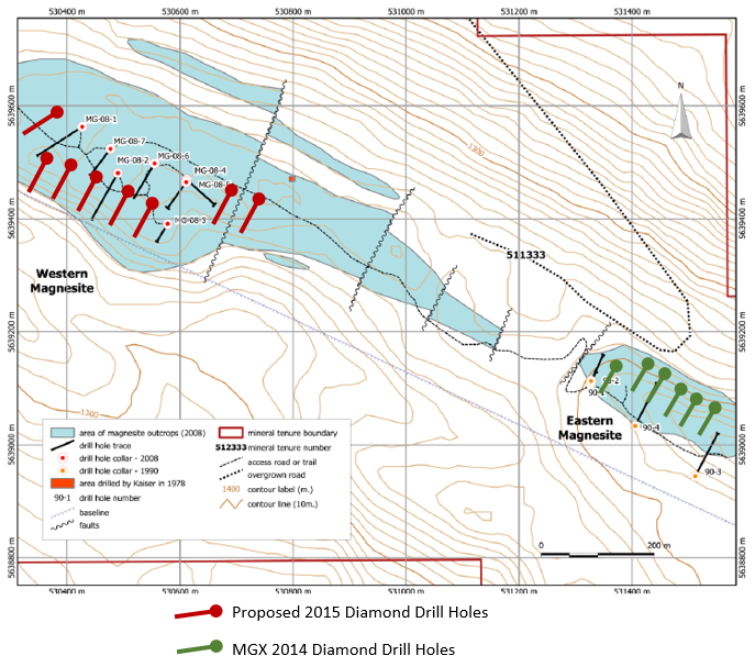An eight-hole program consisting of approximately 1,000 meters of drilling is planned to further prove up the continuity of grades and thicknesses of magnesite mineralization within the Western Zone at Driftwood Creek. Infill drilling will occur around seven drill holes completed in 2008 by Tusk Exploration (see Figure 1). Drill site locations were selected based on geologic mapping and geochemical sampling work completed by MGX as well as re-assay results of historic drill core.