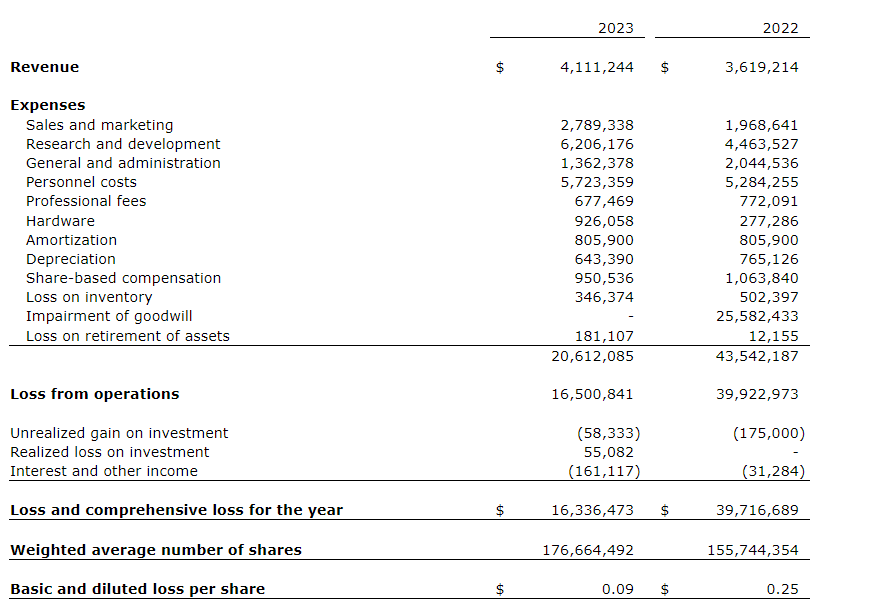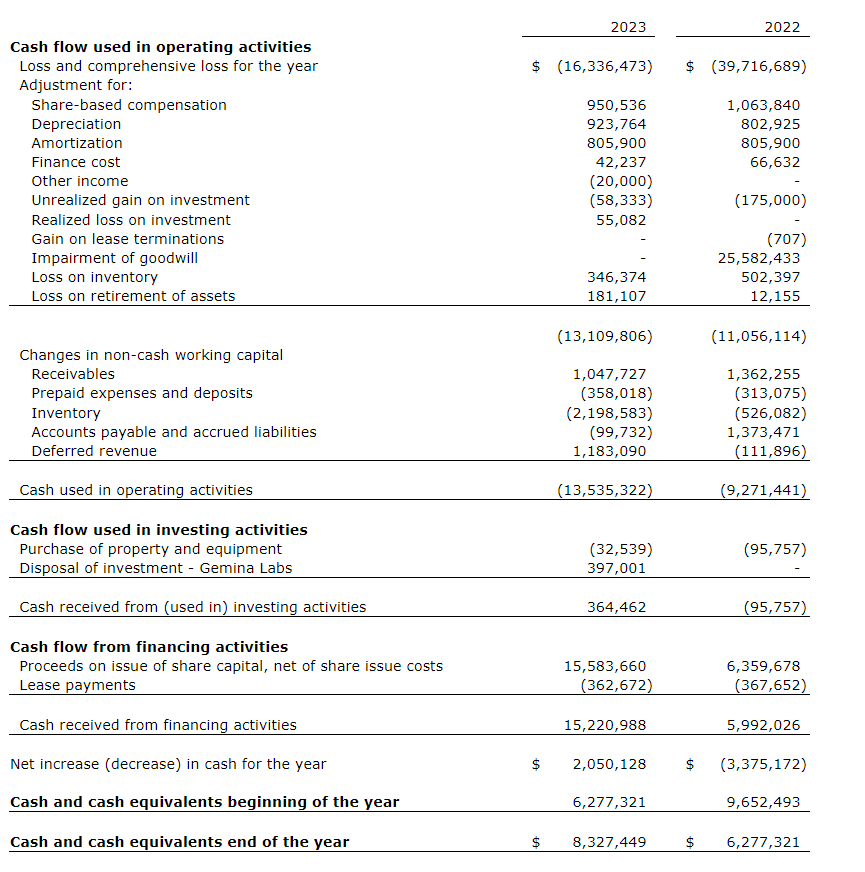 Loss and comprehensive loss was $16.3-million for the year ended July 31, 2023, compared with $39.7-million for the year ended July 31, 2022. The decrease in loss and comprehensive loss for the year pertains to a non-cash goodwill impairment during the prior fiscal year.