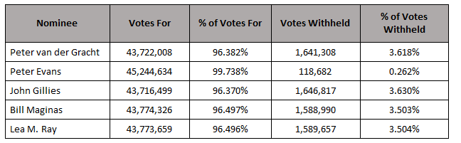 A total of 48,975,912 common shares of the company, or 24.69 per cent of the 198,348,575 issued and outstanding common shares as at the record date of the meeting, were voted at the meeting by proxy. No common shares were voted at the meeting in person. All nominees of the company were elected as directors of the company.