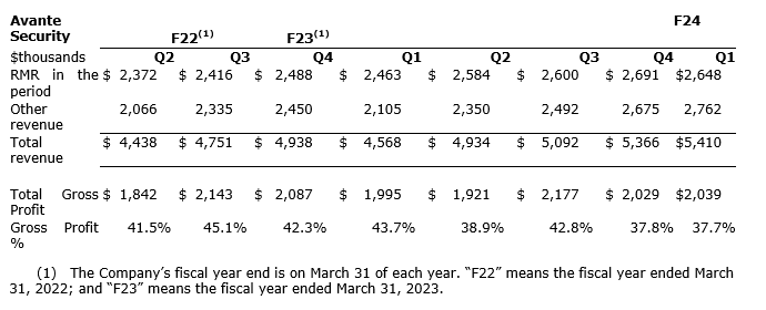 The company's recurring monthly revenues (RMR) from continuing operations during the last eight quarters are summarized in this news release. The Avante Security segment delivered RMR of $2,648 during the first quarter of fiscal 2024, up from $2,463 during the prior-year first quarter.