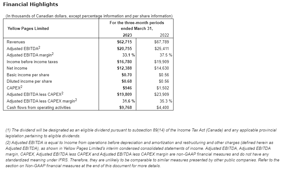 YELLOW PAGES LIMITED REPORTS FIRST QUARTER 2023 FINANCIAL AND OPERATING RESULTS AND ANNOUNCES AN INCREASE IN QUARTERLY CASH DIVIDENDS(1)