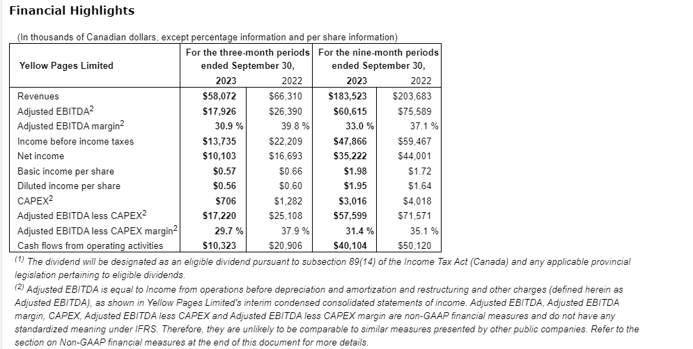 YELLOW PAGES LIMITED REPORTS THIRD QUARTER 2023 FINANCIAL AND OPERATING RESULTS AND DECLARES A CASH DIVIDEND(1)