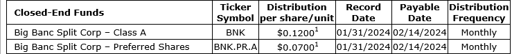 Purpose Investments Inc. has declared distributions for the month of January, 2024, for its open-end exchange-traded funds and closed-end funds.