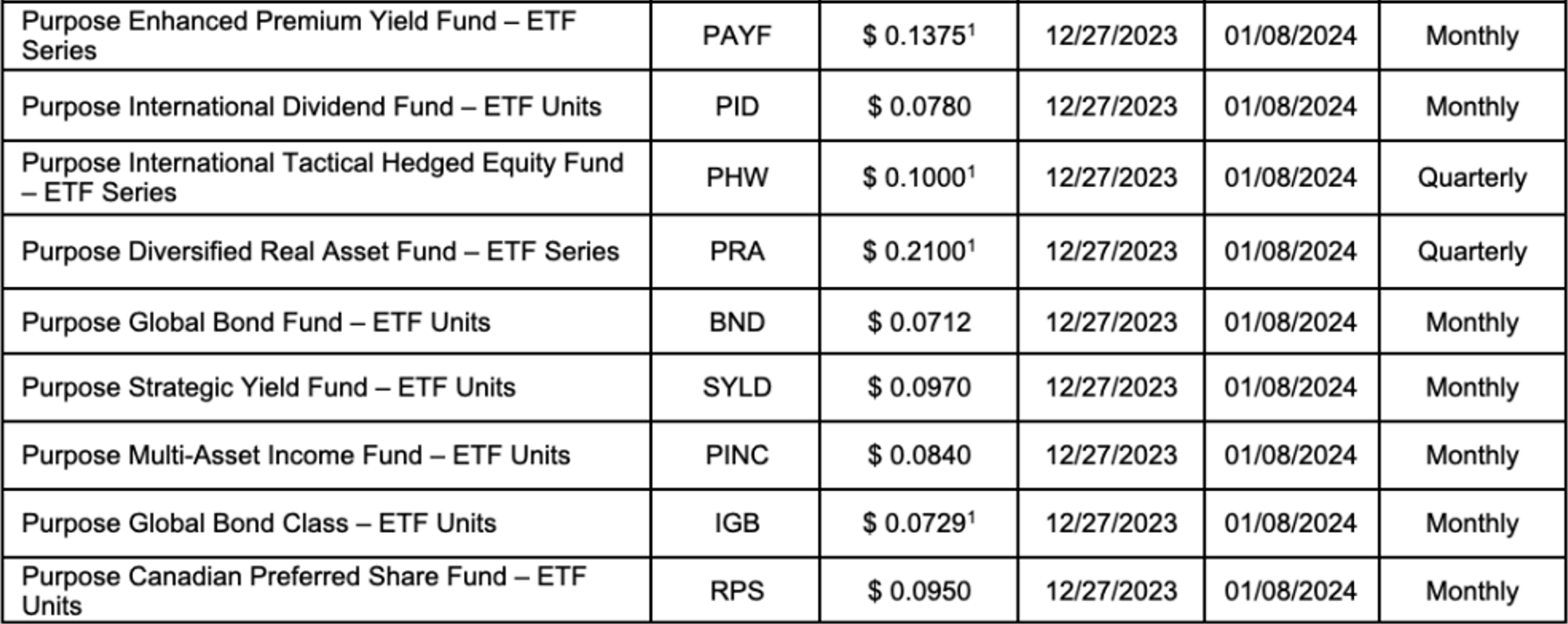 Purpose Investments Inc. has declared distributions for the month of December, 2023, for its open-end exchange-traded funds and closed-end funds.