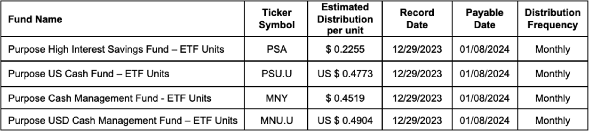 The ex distribution date for all ETFs is Dec. 22, 2023, with the exceptions of Purpose Bitcoin Yield ETF and Purpose Ether Yield ETF, which will have an ex distribution date of Dec. 27, 2023, as well as Purpose High Interest Savings Fund, Purpose U.S. Cash Fund, Purpose Cash Management Fund and Purpose USD Cash Management Fund, which have an ex distribution date of Dec. 29, 2023. The ex distribution date for all closed-end funds is Dec. 28, 2023.