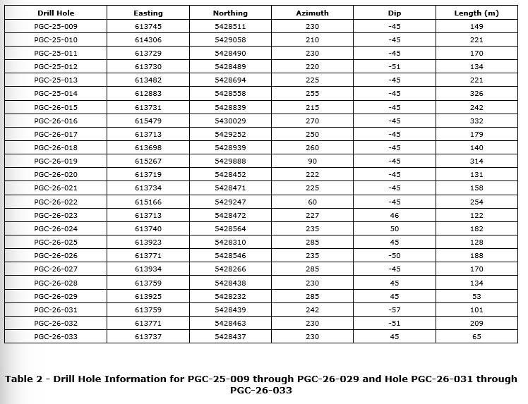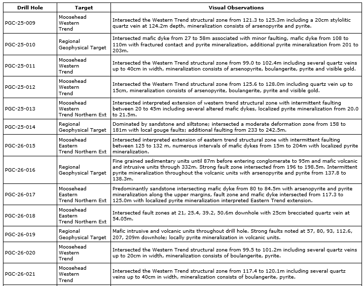 Initial visual observations from recently completed drill holes are summarized in an attached table.