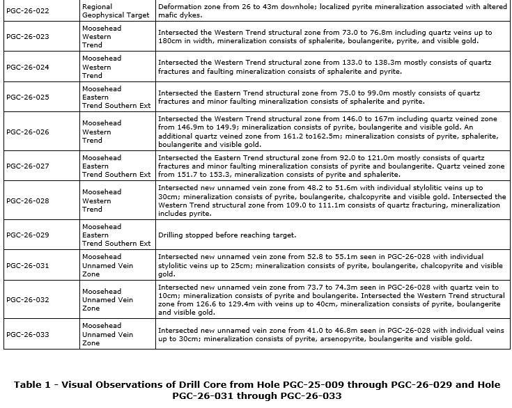 - Stepout drilling on the Moosehead western trend, intersecting a new system, including visible gold in multiple holes;