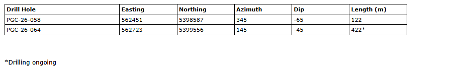 - Drill hole PGC-26-058, encountered vuggy silicified mineralization near the bedrock surface; indications of advanced argillic alteration and silicification and strong pyrite mineralization throughout.