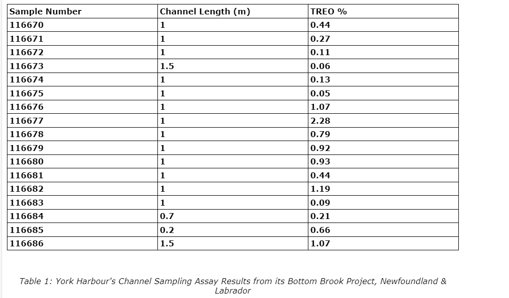 York Harbour's chief executive officer and president, Blair Naughty, comments: "We are encouraged by these promising results from our recent channel sampling at the Bottom Bank rare-earth elements prospect. These outcomes not only affirm the potential of our Bottom Brook project but also start a new chapter under my leadership. I recognize the challenges our shareholders have navigated through, and while acknowledging areas for improvement, I remain optimistic as many of you about our future. As the largest shareholder, deeply committed to our collective success, I am focused on steering York Harbour towards sustained growth and value creation. Our commitment is to leverage the strengths of our core projects and enhance shareholder value through meticulous exploration and strategic planning. With additional technical expertise now on board and a renewed understanding of our key projects, we are poised to aggressively pursue development. Thank you for your continued trust and support as we advance our promising projects and build a robust future together."
