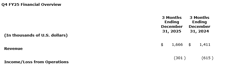 - Fourth quarter revenue of $1.66-million, an 18-per-cetn increase over Q4 2024;