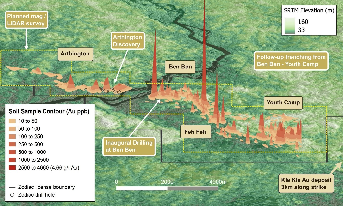 Drilling at Ben Ben represents the next phase in Zodiac Gold's systematic evaluation of the 16-kilometre gold-in-soil anomaly extending from the Arthington Discovery eastward to Youth Camp. Despite its scale, less than 6% of this trend has been drill tested to date. The Arthington Discovery, located approximately 1.3 kilometres west-northwest of Ben Ben, delivered high-grade gold intercepts and near-surface mineralized zones with strong continuity, confirming the fertility of the system and highlighting the potential for additional discoveries along strike.