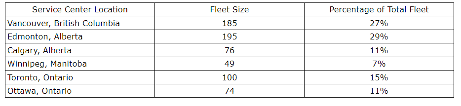 Zedcor currently operates service and equipment storage centres across Canada. The attached table provides a breakdown of Zedcor's MobileyeZ fleet by location.