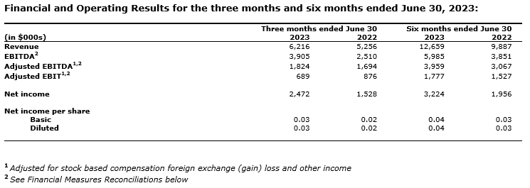 Second quarter 2023 revenues were $6.2-million, and the company had net income before income taxes of $2.5-million or three cents per share. This represented an 18-per-cent increase in revenues compared with Q2 2022 and a 62-per-cent increase in net income for June 30, 2023.