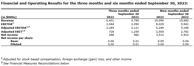 Third quarter 2023 revenues were $6.4-million, the company had adjusted EBITDA (earnings before interest, taxes, depreciation and amortization) of $2.3-million and net income before income taxes was $288. This represented an 11-per-cent increase in revenues compared with Q3 2022.