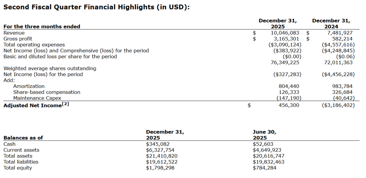 - Over $1.1-million (earnings before interest, taxes, depreciation and amortization) in adjusted EBITDA in Q2 fiscal 2026, demonstrating solid profitability amid continuing top-line growth and cost discipline: