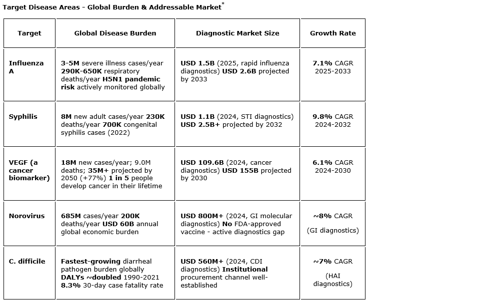 Triera's current catalogue contains aptamers for clinically and commercially significant targets, including influenza A, SARS-CoV-2, vascular endothelial growth factor (VEGF, a solid tumour biomarker), syphilis, norovirus and Clostridioides difficile, among others under development, with binding affinity values (Kd) reported in the subnanomolar range for selected research targets.