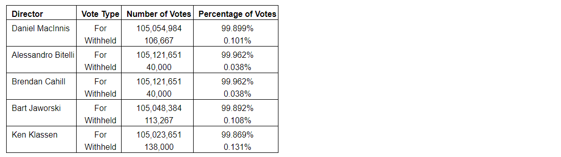 A total of 109,450,166 common shares were represented at the AGM, representing 62.554 per cent of the votes attached to all outstanding common shares as at the record date. All matters submitted to the shareholders for approval, as set out in the company's notice of meeting and information circular dated June 12, 2023, were approved by the requisite majority of votes cast at the AGM.