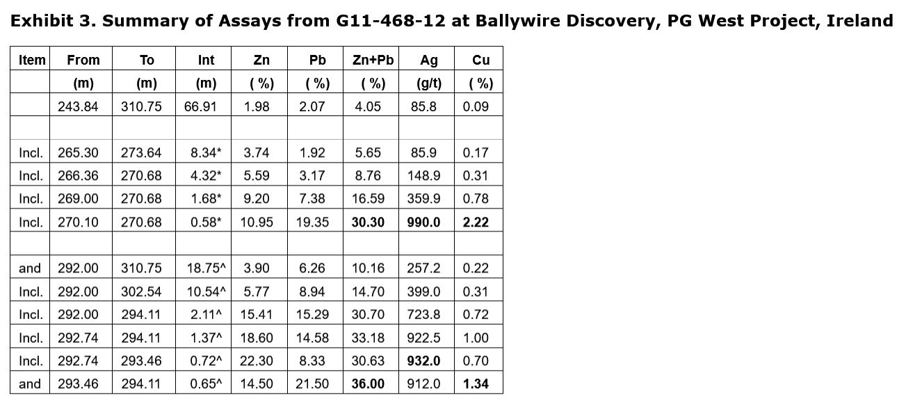 Group Eleven announced the Ballywire discovery in September, 2022. Key intercepts to date include: (i) 3.3 m of 12.5 per cent Zn+Pb and 48 g/t Ag (G11-468-01), (ii) 10.8 m of 10.0 per cent Zn+Pb and 109 g/t Ag (G11-468-03); (iii) 10.1 m of 8.6 per cent Zn+Pb and 46 g/t Ag (G11-468-06); and (iv) 10.5 m of 14.7 per cent Zn+Pb, 399 g/t Ag and 0.31 per cent Cu (G11-468-12).