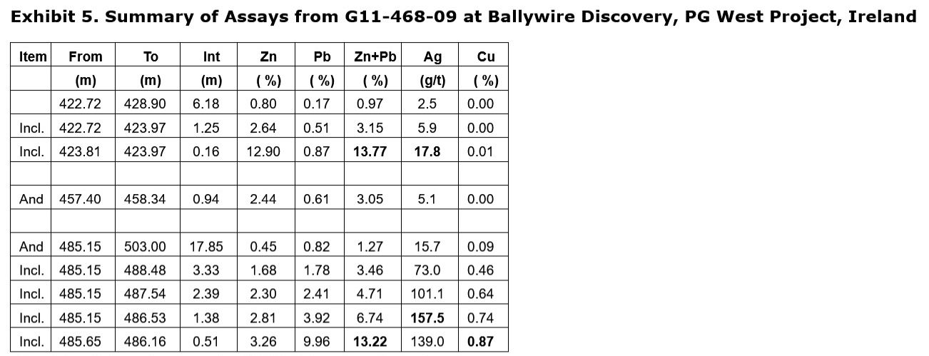 Group Eleven Resources Corp. has released assay results from two recent stepout holes at its 100-per-cent-owned Ballywire zinc-lead-silver discovery, PG West project, Ireland.