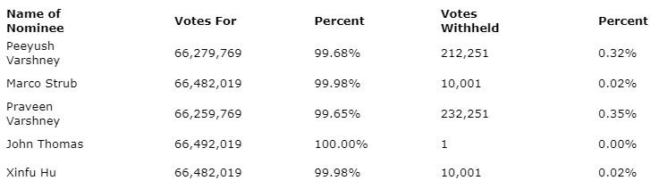 By resolution passed via ballot, the five nominees referenced below were appointed as Directors of the Company to serve until the next annual meeting of shareholders of the Company, or until their successors are elected or appointed. The results of the ballot were as follows:
