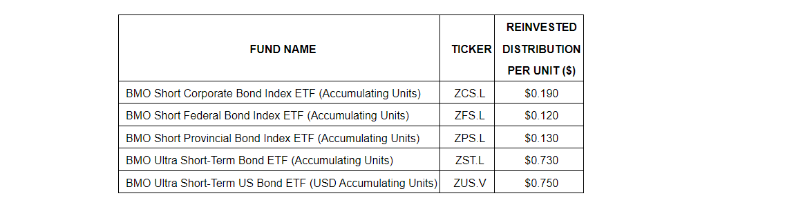 The quarterly cash distributions listed in an attached table are distributed and automatically reinvested in additional accumulating units of the applicable BMO ETF, which are consolidated immediately.