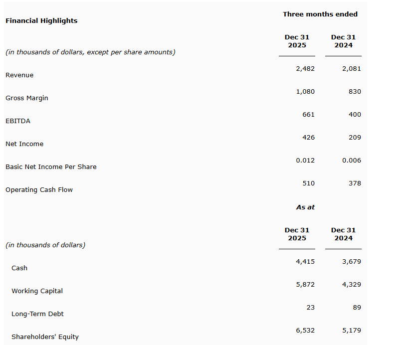 Ztest Electronics Inc. had fiscal 2026 Q2 revenues of $2,481,516, an increase of 19 per cent from the same period last year, with net income increasing over 104 per cent to $425,913.