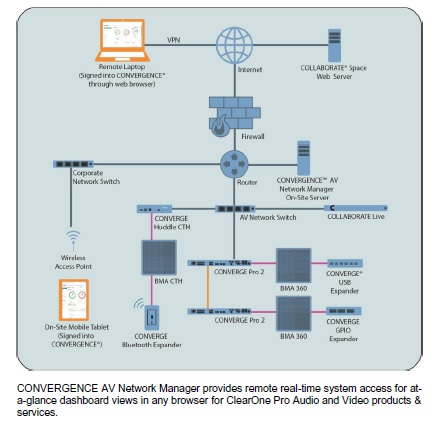 CONVERGENCE software is a unified AV network management platform to monitor, control, and audit ClearOne Pro Audio and Video products and services. Remote real-time system access provides at-a-glance and all-inclusive dashboard views with unlimited scalability designed to support organizations of any size. The powerful and elegant user interface works on any browser from desktop to mobile, keeping administrators up-to-date with email status notifications and the ability to search, sort, and filter to find what is needed quickly.