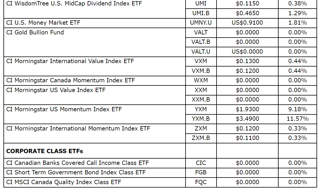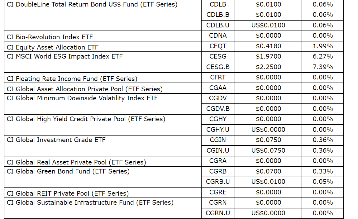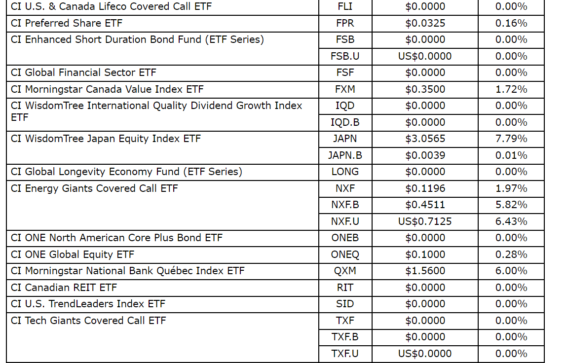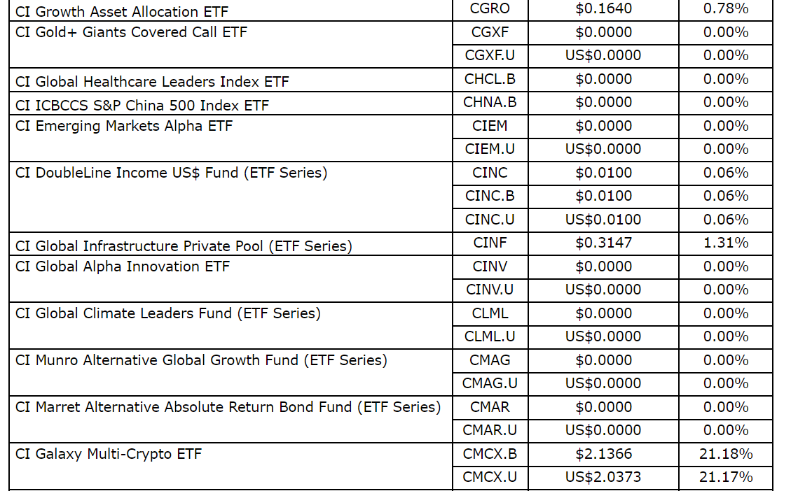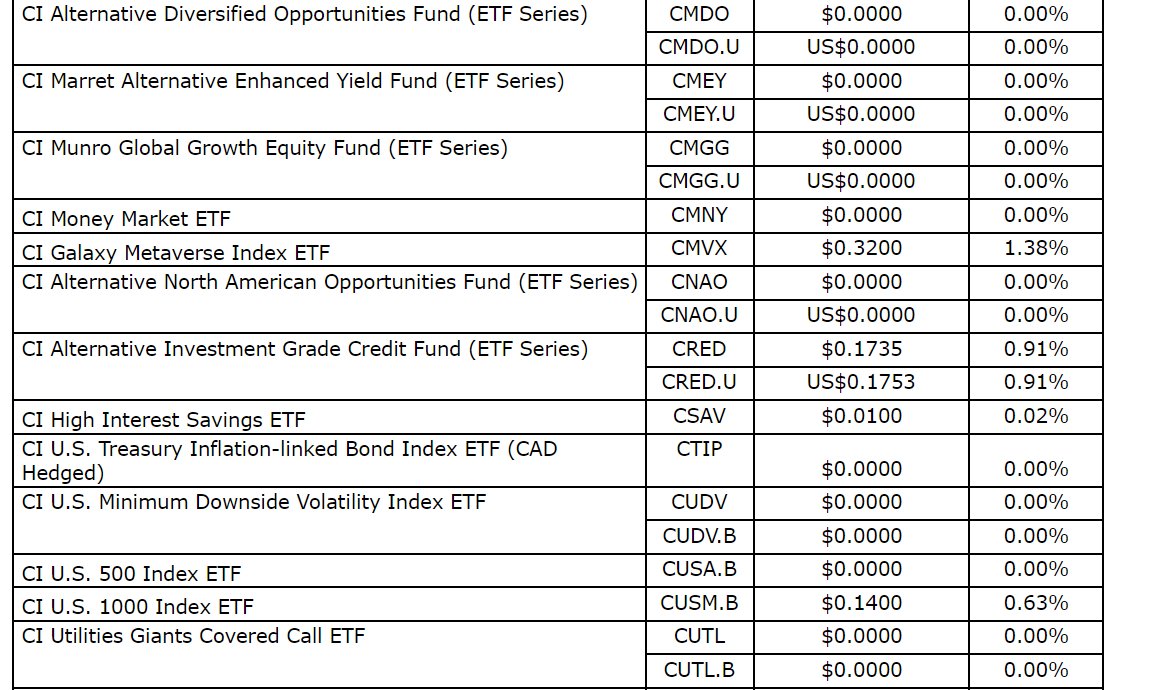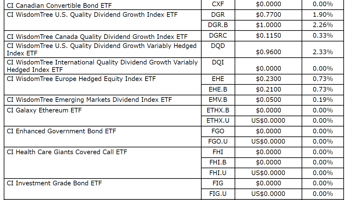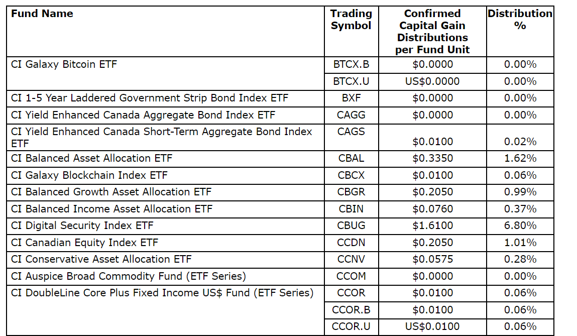 Each of the CI ETFs is required to distribute net income and capital gains earned during the year. The reinvested distributions will generally consist of capital gains and/or any excess net income at year-end. The reinvested distributions will not be paid in cash but will be reinvested and the resulting units immediately consolidated so that the number of units held by each investor will not change. Investors holding units outside of registered plans will have taxable amounts to report and will have an increase in the adjusted cost base of their investment. All distributions will be reinvested on or about Dec. 29, 2023, to unitholders of record on Dec. 28, 2023.