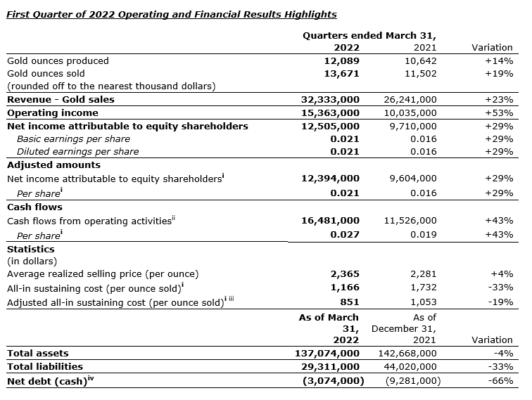 A higher grade (0.82 gram per tonne (g/t), compared with 0.76 g/t for the same period in 2021) and an increase in the average gold price ($2,365 per ounce, compared with $2,281 for the same period in 2021) resulted in a 53-per-cent increase in the operating income and a 43-per-cent increase in cash flows from operating activities. While improving its cash flow, the company continues debt reduction with a net cash position of $3.1-million on March 31, 2022, compared with $9.3-million on Dec. 31, 2021.