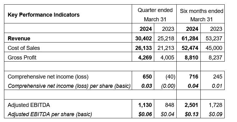 Adjusted EBITDA for the six months ended March 31, 2024, was $2.5-million ($0.13 per share), as compared to $1.7-million ($0.09 per share) during the same six months last year.