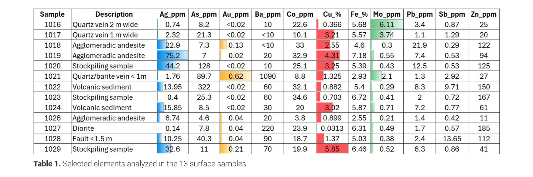 - Sample 1029: 32.6 grams per tonne silver, 0.21 gram per tonne gold and 5.85 per cent copper.