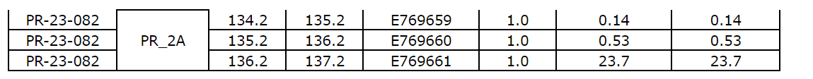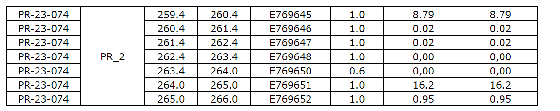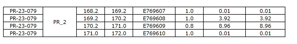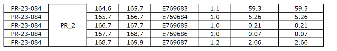 - Hole PR-23-058A -- 9.31 g/t Au over 4.6 m core length (9.31 g/t Au capped, 4.3 m true width) in the PR-2 zone.